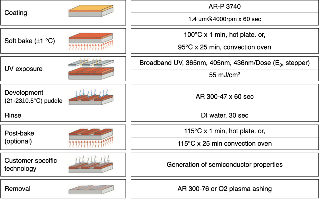 This diagram shows exemplary process steps for AR-P 3740 resists. All specifications are guideline values which must be adapted to own specific conditions. For further information on processing, 👉“ Detailed instructions for optimum processing of photoresists”. For recommendations on wastewater treatment and general safety instructions, 👉”General product information on Allresist photoresists”.