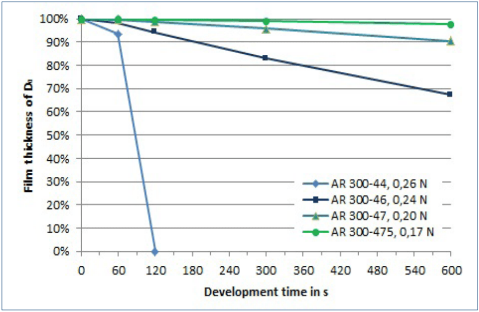 AR-P 3740 may be developed with any of the four TMAH developers. A high sensitivity is associated with high erosion rates. No dark erosion is obtained if weaker developers are chosen (see diagram Influence of developer strength)
