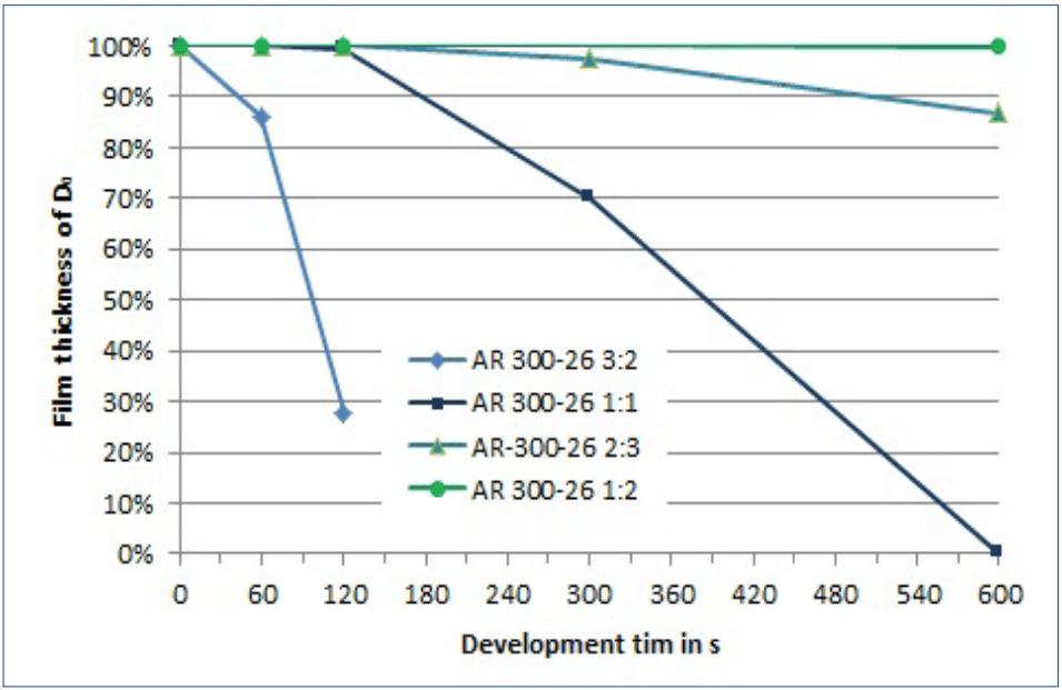 Using a dilution series of AR 300-26, the desired development properties can be adjusted accordingly. A dilution of 3:2 (3 parts AR 300-26, 2 parts DI water) is not recommended, due to the high erosion rate. More suitable in this case is a dilution of 1:1 to 2:1.