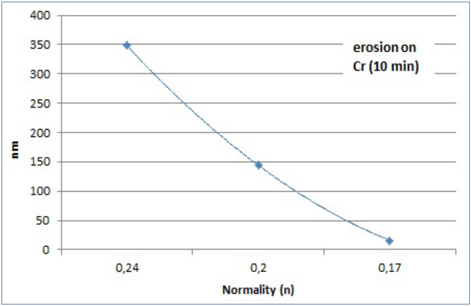Using coated Cr-substrates (thickness 1.5µm), 15–350 nm are removed within 10 min depending on the respective developer strength. The highest erosion is obtained with the strong developer AR300-46 (0.24 n).