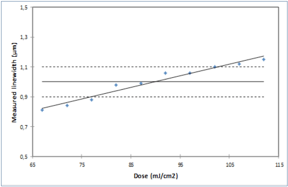The optimum exposure dose for 1 µm lines is 88 mJ/cm2
