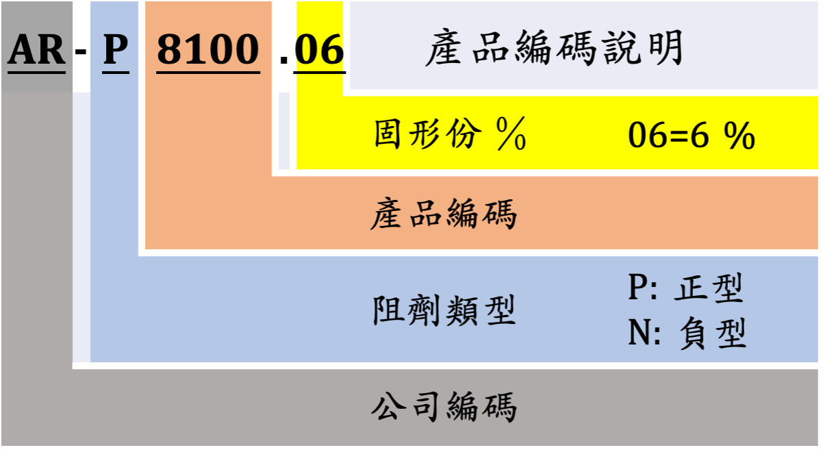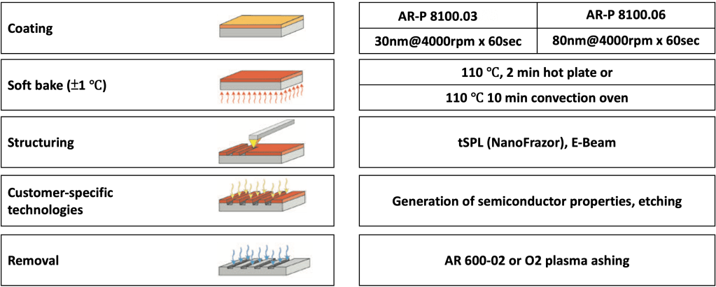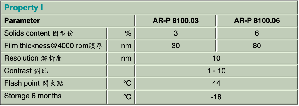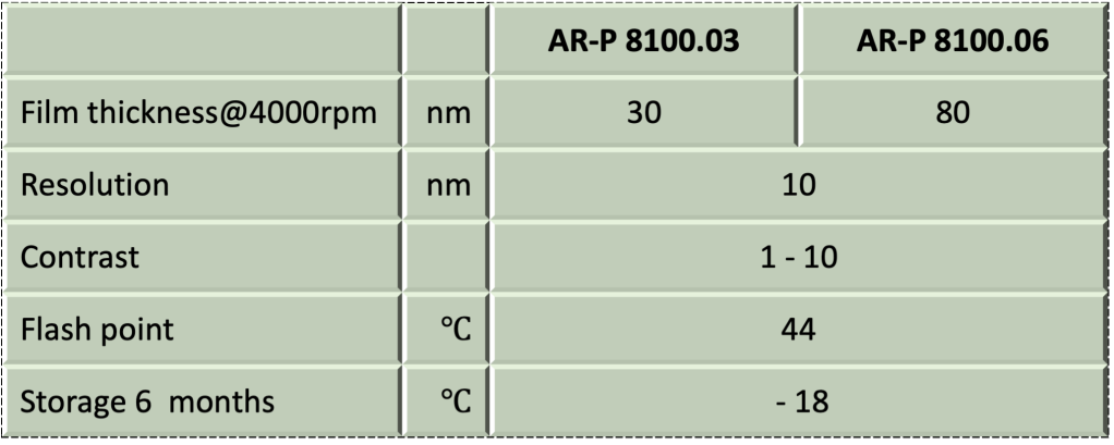 AR-P 8100為原廠配製好的即用型(ready-to-use)熱掃描微影阻劑。優點是無需自行調配。缺點是需在低溫-18℃下運輸,成本較高。在此低溫下儲存,有效期約6個月。目前配製的濃度有: