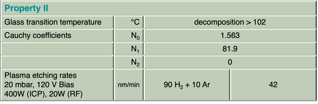 The polymer PPA dissolves easily in anisole. By varying the polymer concentration, solutions can be produced flexibly to realize different film thicknesses values. The film thicknesses can furthermore be varied by changing the spin speeds. This is exemplarily shown for AR-P 8100.03 (solids content: 2.5 %) and AR-P 8100.06 (solids content: 5.5%) in the table “Properties I“.