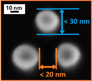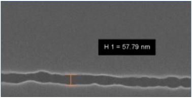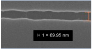 為測試PPA解析度能力,Raith公司寫入不同線寬的PPA層,曝後烤後接著沉積白金。可獲得<20nm的線寬。實驗的最佳解析度可達16nm。
