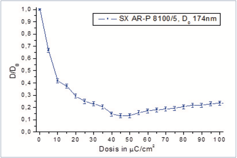 The gradation passes through a minimum, but with increasing dose, also the concurrent cross-linking processes become increasingly important. This undesirable side reaction is due to radicals which are generated during electron irradiation and stabilize the layer by cross-linking. These effects also occur in PMMA layers, but only at much higher exposure doses, and are here used to produce negative PMMA architectures.