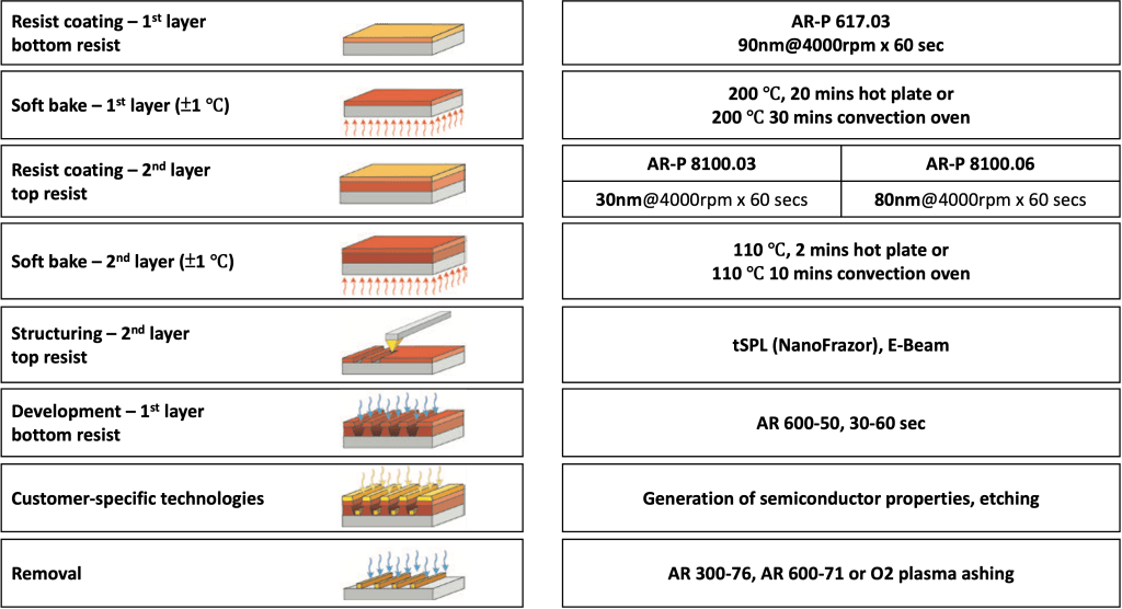 At first, AR-P 617.03 is coated and tempered. After cooling to room temperature, Phoenix 81 is applied as top resist. The layer thickness can be varied in a range between 20 nm and 160 nm. Subsequently, the two-layer system is tempered. The thickness ratio of both layers influences the structural geometry. To obtain a strong lift-off effect, a thin PPA layer and a thick bottom layer is recommended. For a dimensionally accurate pattern transfer however, both layers should be approximately equal in thickness. The entire system must be optimized regarding the respective application.