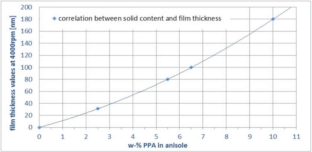 Dependency of film thickness on solids content (anionic PPA in anisole, 4000 rpm, 30 s, open chuck)